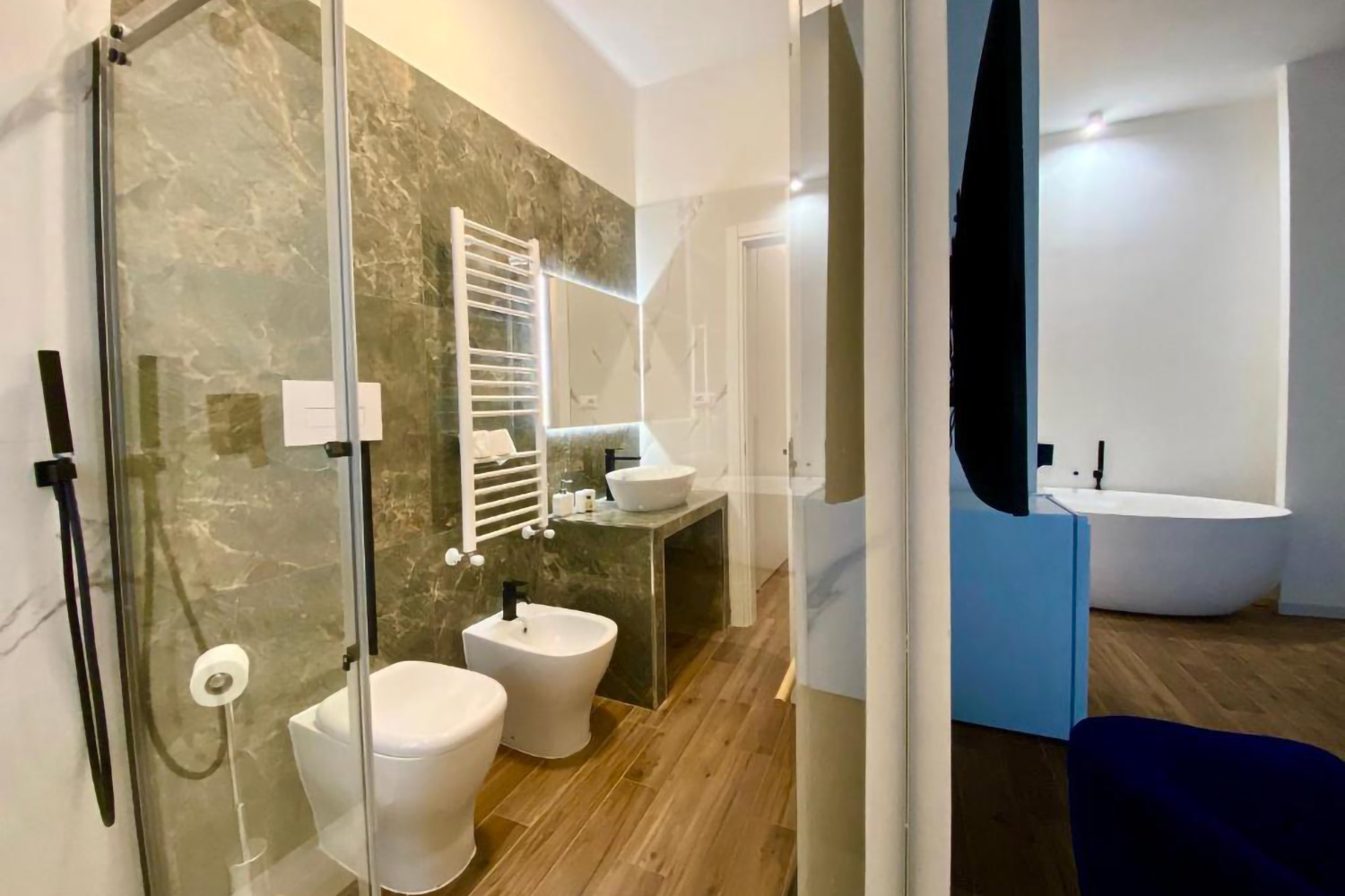 Deluxe Roma è una camera spaziosa, con un arredamento moderno e dettagli eleganti. Perfetto per soggiorni in città e viaggi di nozze. La vista dal balcone si apre sull'imponente torre della Chiesa e sul porto. Connessione wi-fi ad alta velocità, una romantica vasca da bagno in camera e ampio armadio.